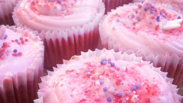 Pendant la cuisson : dans un grand bol (ou petit saladier), mélanger le creamcheese au sucre glace (ne pas hésiter à goûter pour doser au mieux le sucre), ajouter quelques gouttes d'arôme de framboise (facultatif) et un peu de colorant alimentaire rose jusqu'à obtenir le rose souhaité (ici, un rose Barbie soutenu).