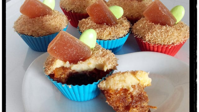Recouvrez le dessus de chaque cupcake de crème et plongez dans les dans la coco grillées.