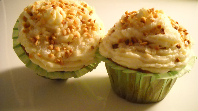 Préparez la crème au beurre en fouettant le beurre mou et le sucre glace. Déposez la crème au beurre sur les cupcakes a l'aide de la poche a douille puis décorez avec les éclats d'amandes et de la noix de coco râpée.