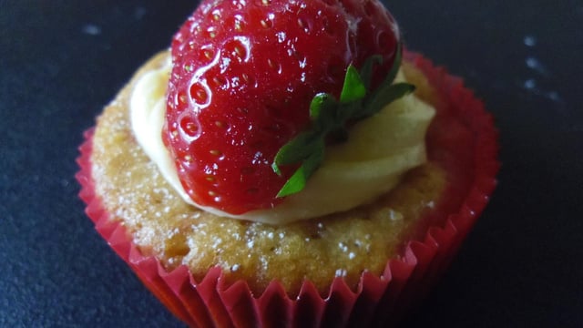 Mélange le beurre en pommade avec le sucre glace et la confiture. Remplis une poche à douille, munie d'une douille cannelée 11mm. Décore les cupcakes avec une petite rosace. Dépose une moitié de fraise sur chacun.