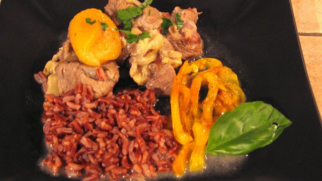 Ce plat peut être accompagné de riz rouge de Camargue et de lanières de poivrons à 5 minutes au micro-ondes avec un filet d'huile d'olive. Ceux qui souhaitent une sauce plus consistante saupoudrer de farine la viande avant d'ajouter le vin blanc, et remplaceront le yaourt par de la crème fraîche. (mais ce ne sera plus un plat allégé).