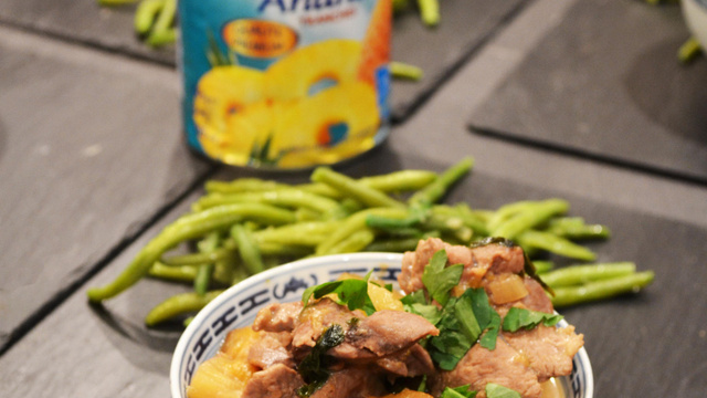 Découper l'ananas en petits cubes. Ajouter le tout dans la poêle avec le jus de la moitié du citron vert.