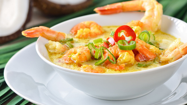 Servez le curry de crevettes chaud, avec du riz blanc cuit à l'eau ou à la vapeur.