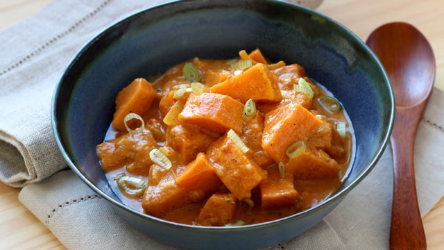 Une belle recette alliant patates douces et le curry avec une pointe de gingembre pour plus de goût.