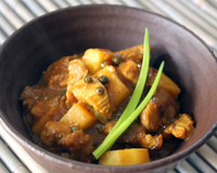 - Dans de l'huile d'olive, faire revenir les oignons, puis ajouter les cubes de viandes. laisser dorer.Ajouter les légumes coupés en morceaux.laisser dorer. ajouter les épices. puis le lait de coco.Laisser cuire doucement à couvert.