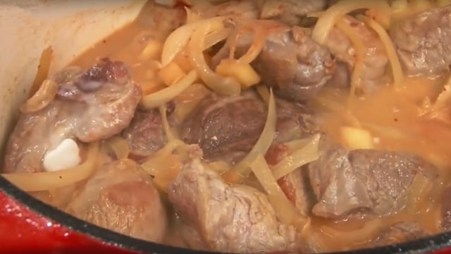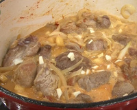 Dans une cocotte, chauffer un filet d'huile d'olive et mettre la viande découpée en morceaux. Laisser colorer sur chaque face et ajouter les oignons émincés finement. Laisser mijoter 5 minutes. Ajouter les pommes coupées en cubes, le piment d'Espelette, le curry et laisser mijoter 5 minutes.