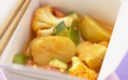Faites chauffer un peu d'huile d'olive dans le wok et faites revenir l'oignon. Ajoutez l'ail, le gingembre et le curry en poudre