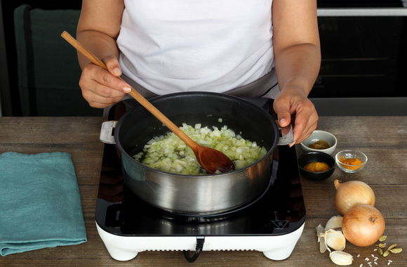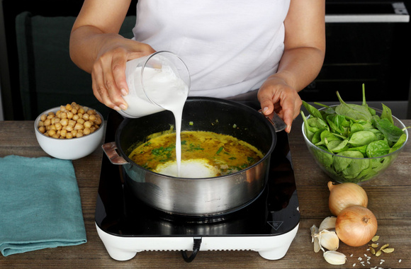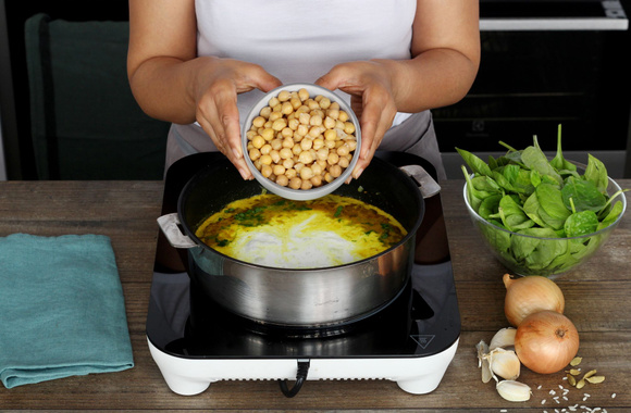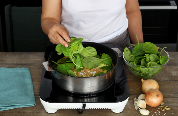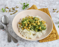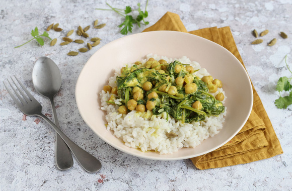 Un plat végétarien complet, inspiré de la cuisine indienne. Dans ce curry, les pois chiches se marient à merveille avec les épinards. On le sert avec un riz basmati parfumé à la cardamome.