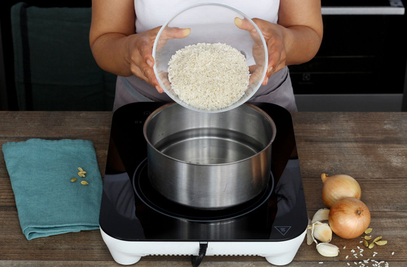 1Faites tremper le riz dans de l'eau froide pendant 20 minutes, puis lavez-le et versez-le dans une casserole avec une grosse pincée de sel. Couvrez avec de l'eau jusqu'à 1 cm au-dessus de la surface du riz, portez à ébullition, ajoutez les graines de cardamome et cuisez sans couvercle pendant 15 minutes.