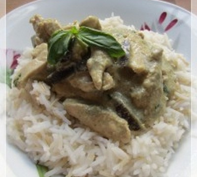 Dans une sauteuse, diluer la pâte de curry vert avec la moitié du lait de coco. Faire bouillir puis ajouter le poulet et l'aubergine. Ajouter également le reste de lait de coco et laisser cuire à couvert à feu doux pendant 20 min. Enlever le couvercle et poursuivre la cuisson encore 10 minutes. Juste avant de servir, ajouter le basilic ciselé et bien mélanger. Vous pouvez également ajouter un peu de piment frais, mais ce n'était pas nécessaire pour moi, le curry était assez épicé.