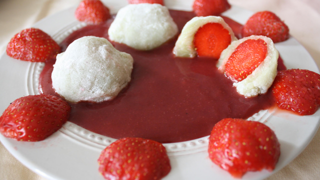 Une recette classique de daïfuku à la fraise mais servi avec un coulis de fraise.