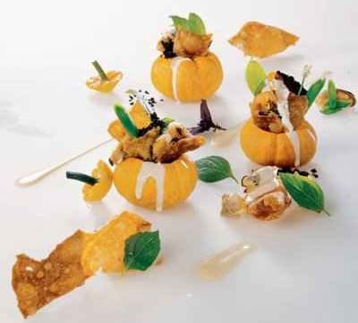 Nettoyer à l'eau courante à l'aide d'une brosse. Avec un emporte pièce de 5 cm de diamètre, marquer la courge tout autour du pédoncule. Découper le couvercle à l'aide d'un couteau bien aiguisé. Vider la courge des ses graines en prenant soin de garder la chair à l'intérieur. Cuire séparément à l'anglaise les couvercles et les courges jusqu' à ce que la chair soit tendre. Réserver. - 3La réalisation des différentes garnitures :