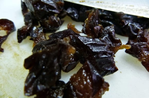 4Hacher les amandes, les noisettes, les pistaches et les pruneaux secs.