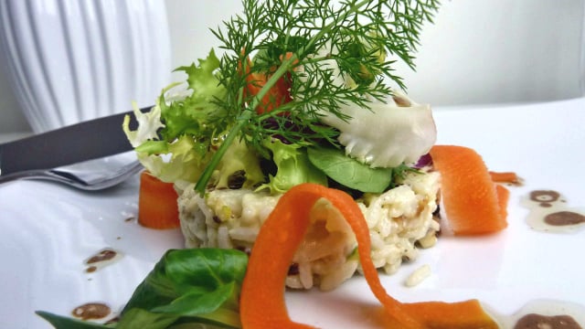 Dans une assiette, déposer un cercle inox de 10 cm de diamètre. Le remplir du riz composé, bien lisser le dessus à l’aide d’une spatule inox. Retirer le cercle et déposer tout autour les carottes cuites. Poser sur le riz, une petite touffe de salade composée et y verser dessus un peu de vinaigrette balsamique. Pour terminer votre assiette, verser quelques gouttes de vinaigrette balsamique autour du riz.