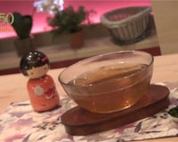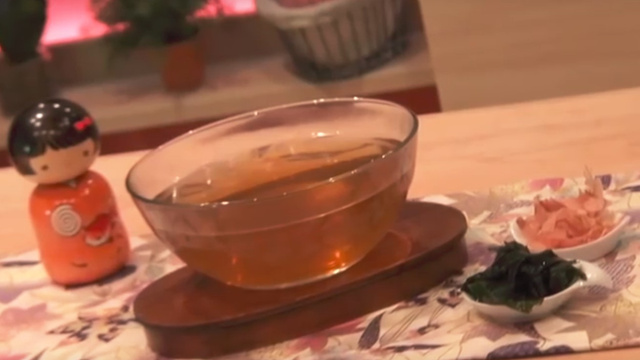 A frémissement, retirer le kombu. Ajouter la bonite et laisser cuire jusqu'au premier bouillon, retirer du feu. Laisser les copeaux de bonite retomber au fond de la cocotte. Tamiser le bouillon et servir.