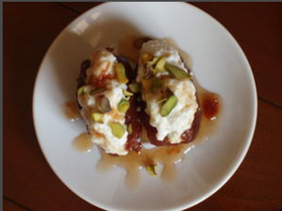 Mélanger la crème et la brousse, mettre la crème obtenue dans un linge propre dans une passoire et la laisser égoutter sur une assiette au frais (au réfrigérateur) 2 heures. Dénoyauter les dattes sans les séparer, bien les écarter et les fourrer d'une cuillerée à café de la crème de brousse, reformer les dattes en laissant les lobes légèrement écartés avec la farce bien visible. Dresser dans chaque assiette une quenelle de crème de brousse, entourer en rosace de 5 à 7 dattes fourrées (selon leur grosseur), arroser de sirop d'érable les dattes et le tour de l'assiette, saupoudrer d'amandes effilées préalablement grillées 5 minutes au four ou de pistaches hâchées et servir.