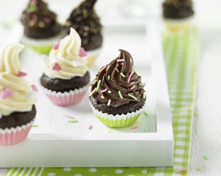 Laver la poche à douille et réitérer l'opération avec la ganache au chocolat au lait. Décorez les rosaces de vermicelles multicolores.