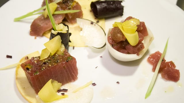Déposez vos légumes dans votre assiette, préparez vos découpes de thon en blocs, tartare, cubes... que vous positionnez elles aussi.