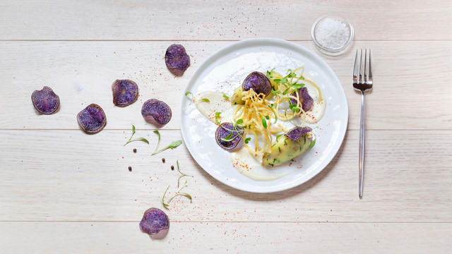 Écrasez vos pommes de terre et ajoutez-y un filet d’huile d’olive, le persil, l’échalote et les olives. Taillez en fines tranches les pommes de terre violettes. Faites-les frire dans de l’huile d’olive. Faites chauffer la crème liquide et ajoutez le parmesan. Salez et poivrez. À l’aide d’un économe, taillez des tagliatelles dans vos six pommes de terre jaunes restantes. Faites-les frire dans un peu d’huile d’olive. Posez deux quenelles de pommes de terre écrasées sur chaque assiette.