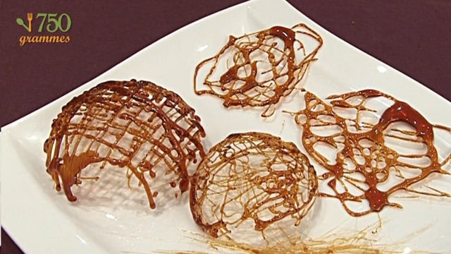 Avec une cuillère à soupe, déposez des filets de caramels sur le dos de la louche, en réalisant des stries pour former comme un panier.