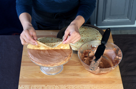 10Recouvrez avec une crêpe, badigeonnez à nouveau de Nutella et continuez ainsi jusqu'à épuisement des crêpes.