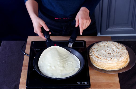 Déposez les crêpes au fur et à mesure sur une assiette et recouvrez d'un torchon afin qu'elles ne sèchent pas.