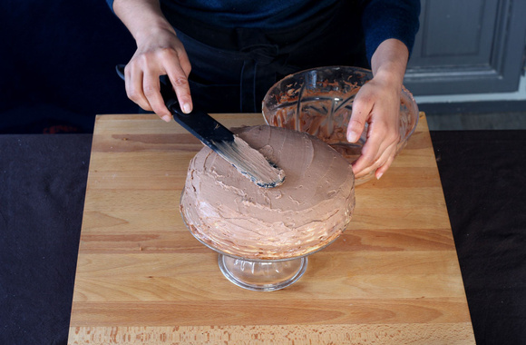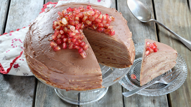 11Recouvrez le dessus et les côtés du gâteau de crêpes avec la crème au Nutella puis décorez avec les graines de grenade.