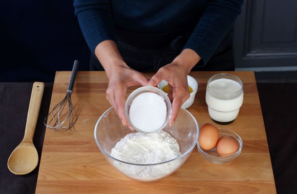 1Mélangez la farine, le sucre et le sel dans un grand saladier.