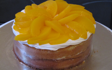 - 3Montage :Coupez la génoise en deux. Posez une partie sur un disque doré, ou le plat de service. Imbibez la première partie du biscuit avec le jus des pêches. (Environ 6 cuillerées à soupe.)