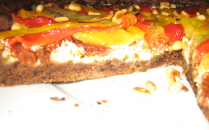 Une pâte à tarte aux olives qui s'accorde merveilleusement bien avec la fraîcheur du chèvre, des poivrons et des tomates séchées.