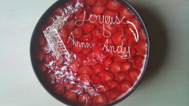 Quand le coulis est refroidis (mais pas encore gélifié) le répartir sur la surface du gâteau. Décorer avec des tranches de fraises et des copeaux/structures de chocolat blanc.
