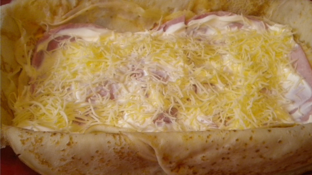 Beurrer un plat allant au four puis faire des couches, en commençant par les crêpes. Laisser des crêpes dépassées sur les côtés pour pouvoir les rabattre sur le dessus à la fin. S'il y a un trou au milieu du plat, y mettre des crêpes pour combler. Puis recouvrir les crêpes d'une couche de jambon (laisser les tranches entières).