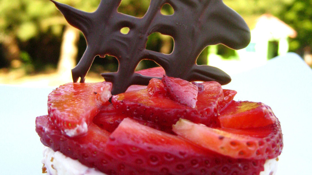 Déposez l'entremets fraises et mascarpone dans les cercles individuels. Placez au froid pour deux heures environ. Décerclez, puis recouvrez les entremets du reste de fraises. - 5