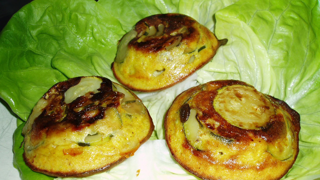 Mettre les courgettes dans les empreintes tartelettes et verser dessus la préparation.