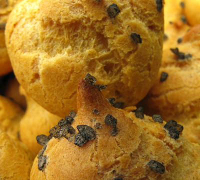 Déposer quelques grains de gros sel noir ou de graines de sésame noir sur chaque chouquette et enfourner dans le four chaud à 250°C et baisser à 160°C pendant 30 minutes.