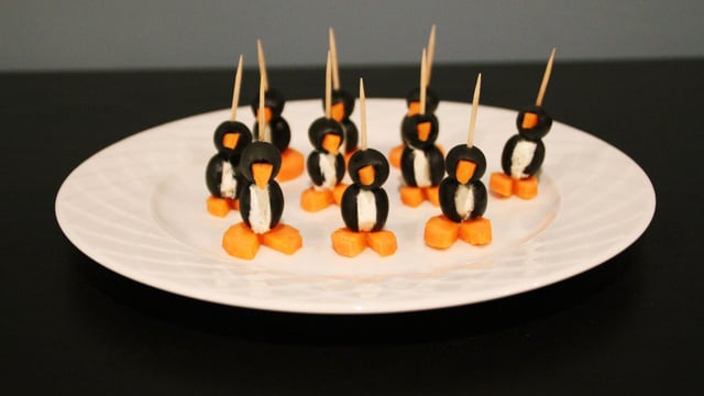 Découper une fine part de la rondelle de carotte (pour le nez). Entrer le morceau de carotte (nez) dans le trou existant d'une olive (la tête).