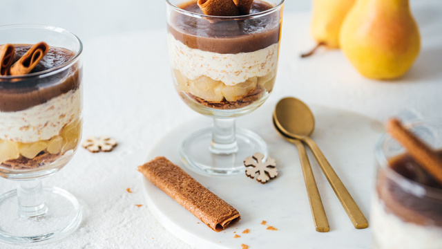 Montage : dans le fond de chaque verre, déposer 2 crêpes dentelle nature grossièrement émiettées, puis ajouter une couche de poires. Ensuite à l’aide de la poche à douille, déposer une couche de crème chantilly aux crêpes dentelle nature, puis terminer avec une couche de crème de marrons.