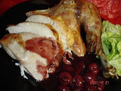 ajouter un peu de beurre manié jusqu'à la consistance voulue et ajouter les cerises.Rectifier l'assaisonnement.