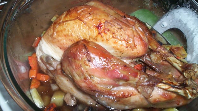 Arroser le dinde de whisky et la placer dans un plat à four avec les légumes et le bouillon.