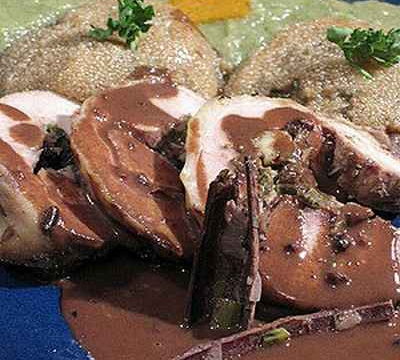 Déglacer avec le vin et le Campari de la marinade. Porter à ébullition et bien gratter les sucs. Réduire le feu. Ajouter l'ail, le bouquet garni, un peu de sel, la cuisse. Cuire à couvert à feu tout doux ou au four à 120°C pendant deux heures. Filtrer le jus dans une casserole. Le faire un peu réduire (en chauffant fortement). Hors de feu, incorporer au fouet le chocolat puis les 60 g de foie gras bien froid en petits morceaux. Goûter et rectifier l'assaisonnement. Oter la ficelle de la dinde et couper des tranches de un centimètre d'épaisseur. Couler un peu de sauce sur chaque assiette. Disposer harmonieusement dessus les tranches farcies. Ajouter un filet de sauce. Servir avec du riz, du quinoa ou du céleri.