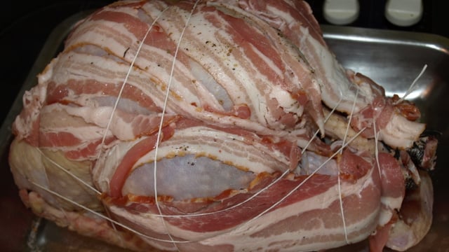 Entourez la volaille de tranches de lard que vous maintiendrez par un fil de cuisine. - 2