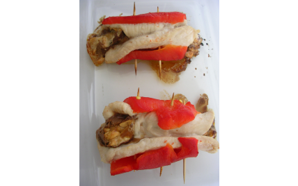 Entourer chaque escalope chaude de lamelles de poivron chaud ou tiède Servir aussitot !