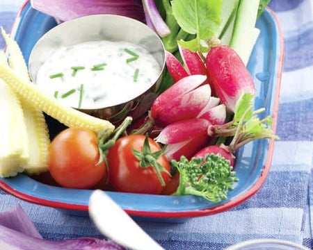 Placer tous les légumes dans un plat de présentation accompagnés des 3 sauces.