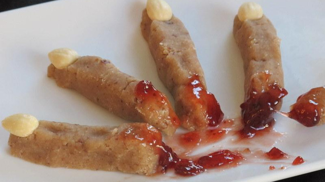 - Tremper les doigts dans la confiture pour imiter le sang