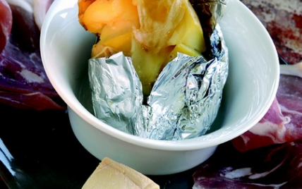 A la fin de la cuisson, ouvrir l'aluminium en croix. Rajouter sur la pomme de terre des lamelles de reblochon.
