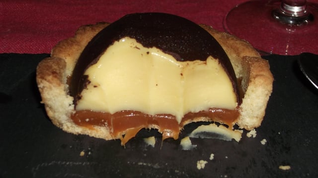 Dôme crème de chocolat blanc en coque de chocolat noir, sur tartelette en fond de caramel au beurre salé.