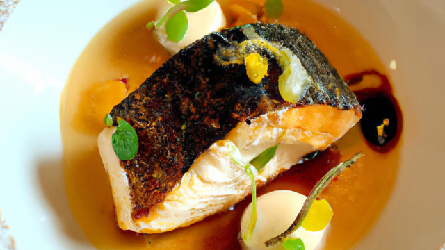 Retirer la peau des filets, disposer le sabayon à la poche sur les filets, enfourner sous le gril jusqu'à coloration. Dans l'assiette, mettre le salpicon de pommes, poser dessus la dorade, puis un trait de sauce.