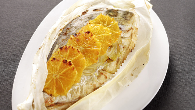 Saler, poivrer, ajouter le fenouil puis l'orange. Arroser d'huile à votre convenance, refermer en papillote et enfourner 15 minutes.