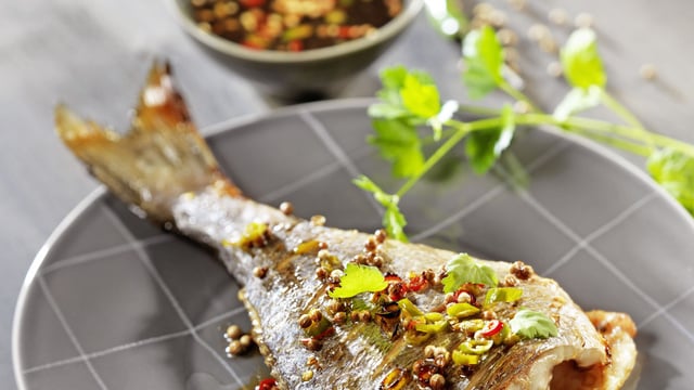 Enfourner le poisson 20 à 25 minutes, tout en l'arrosant de temps en temps. Parsemer de coriandre ciselée avant de le servir.