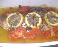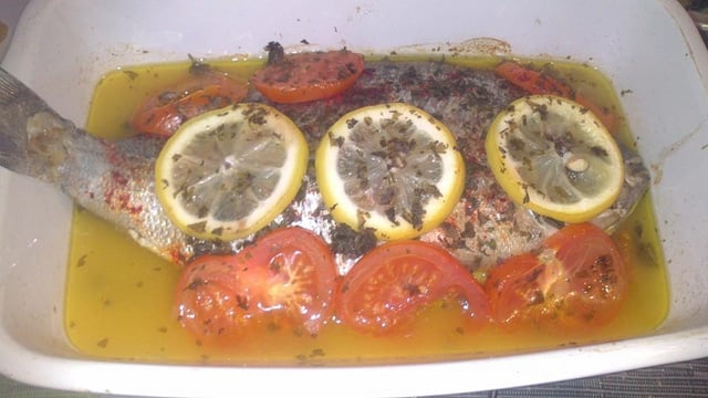 Deux belles dorades cuites au four avec des tomates séchées, du citron et de l'huile d'olive.